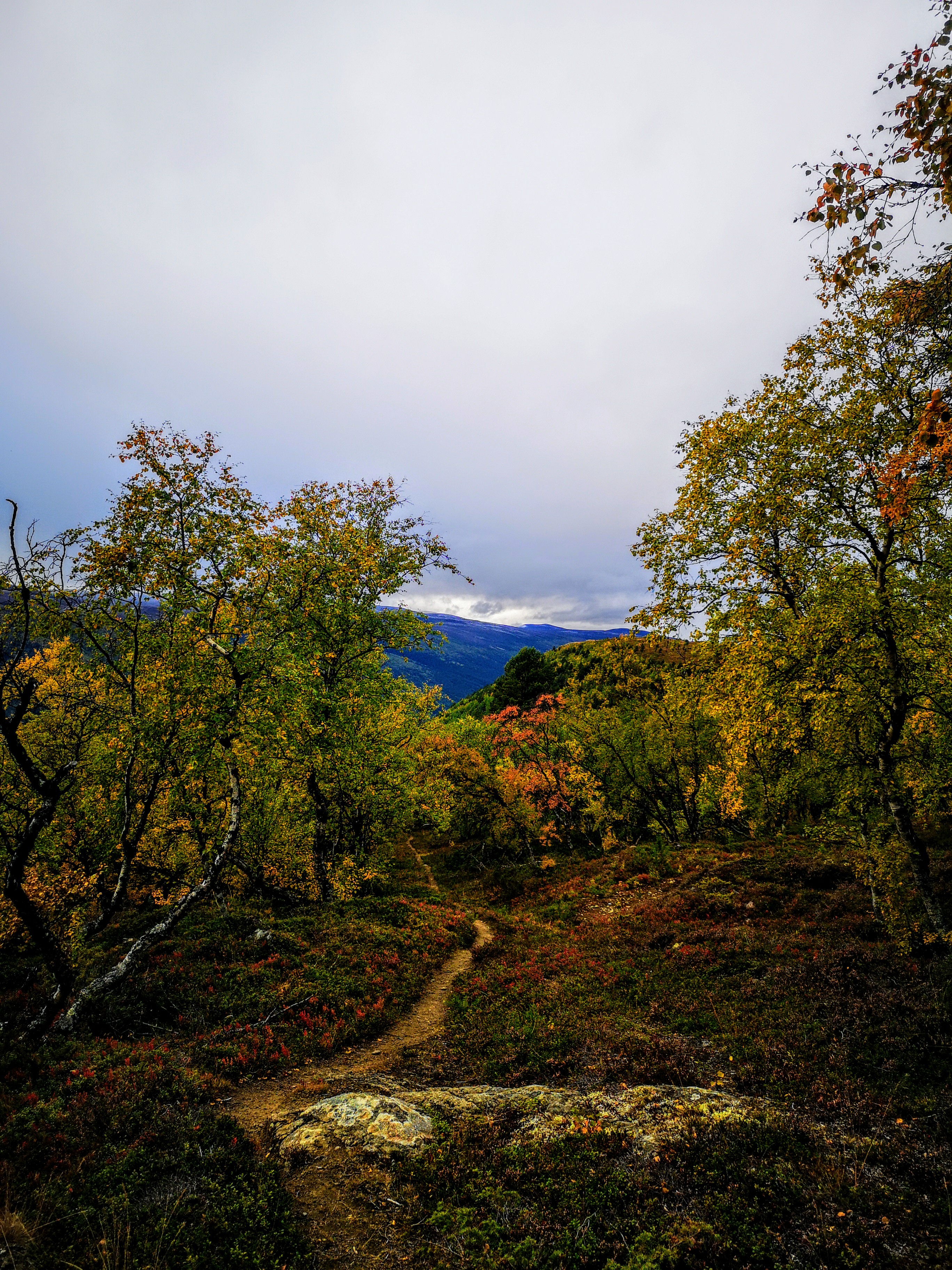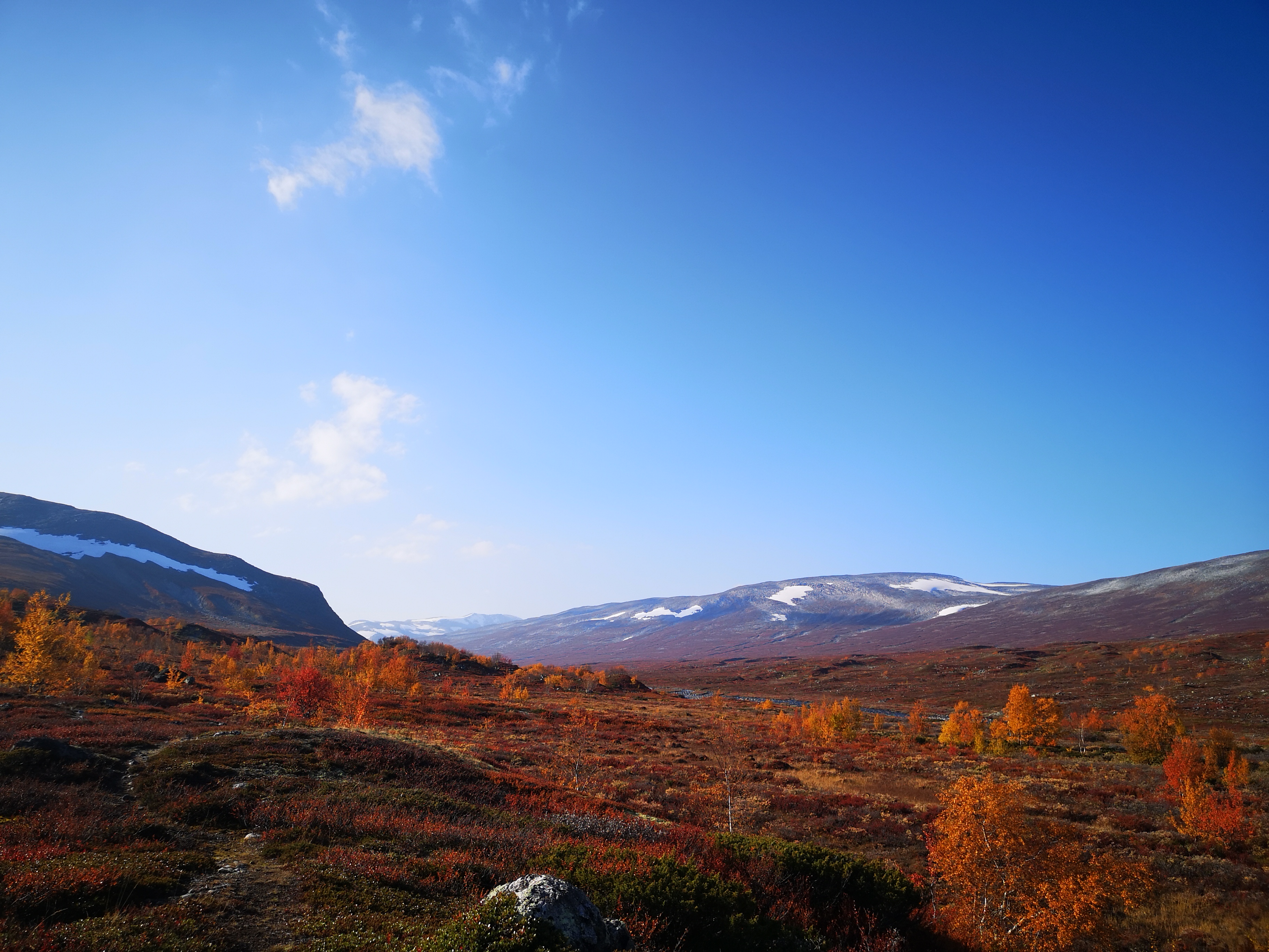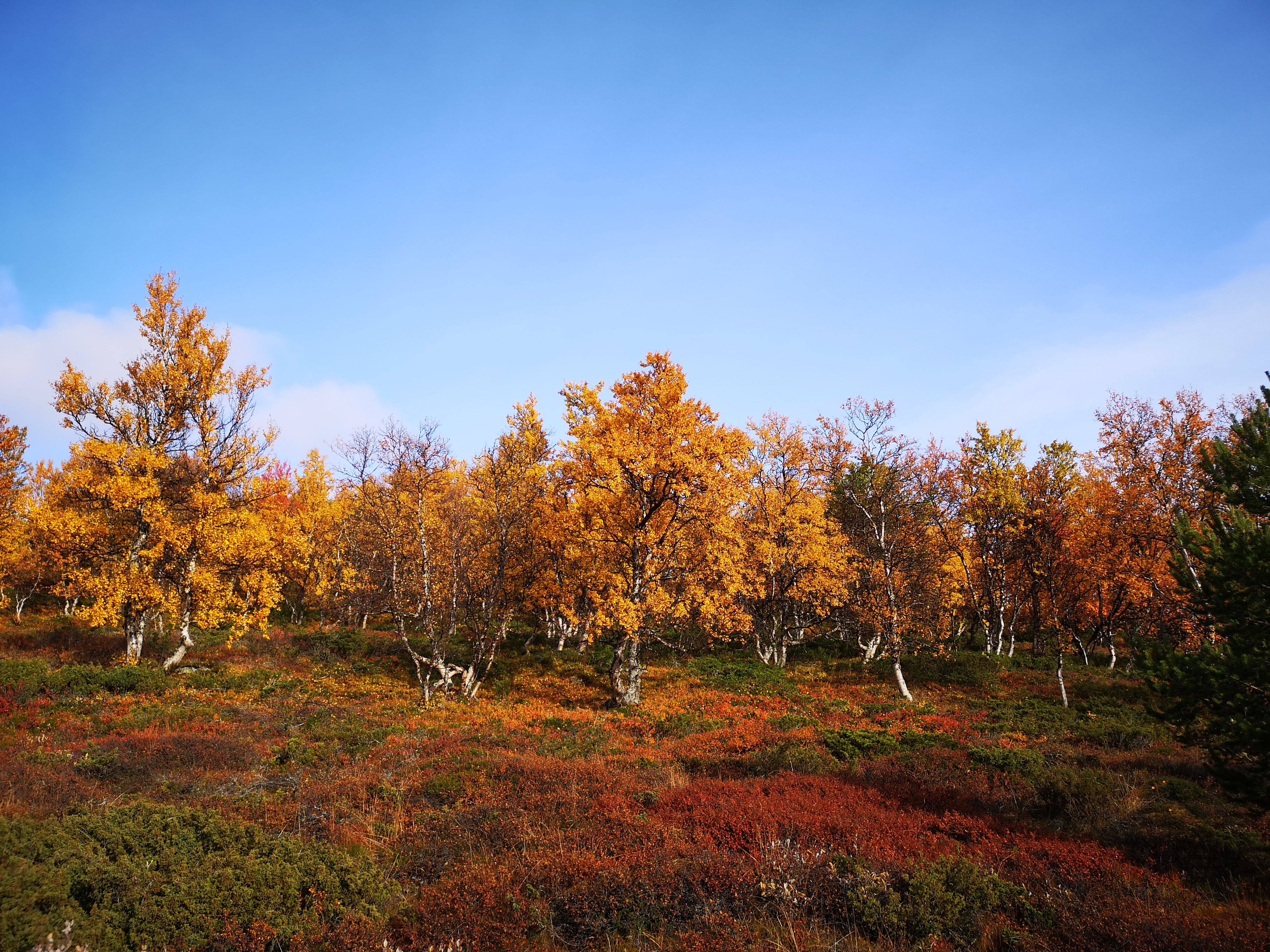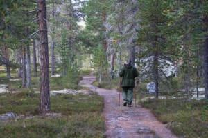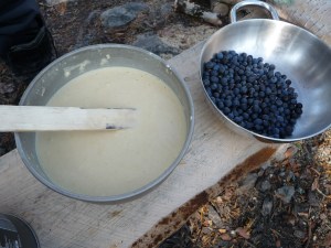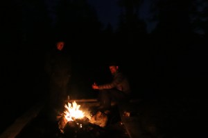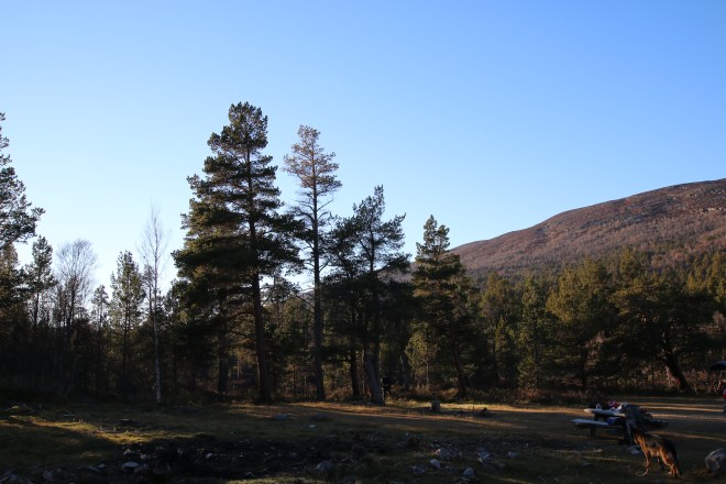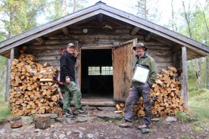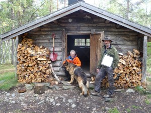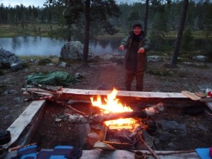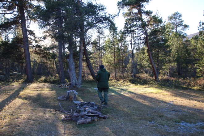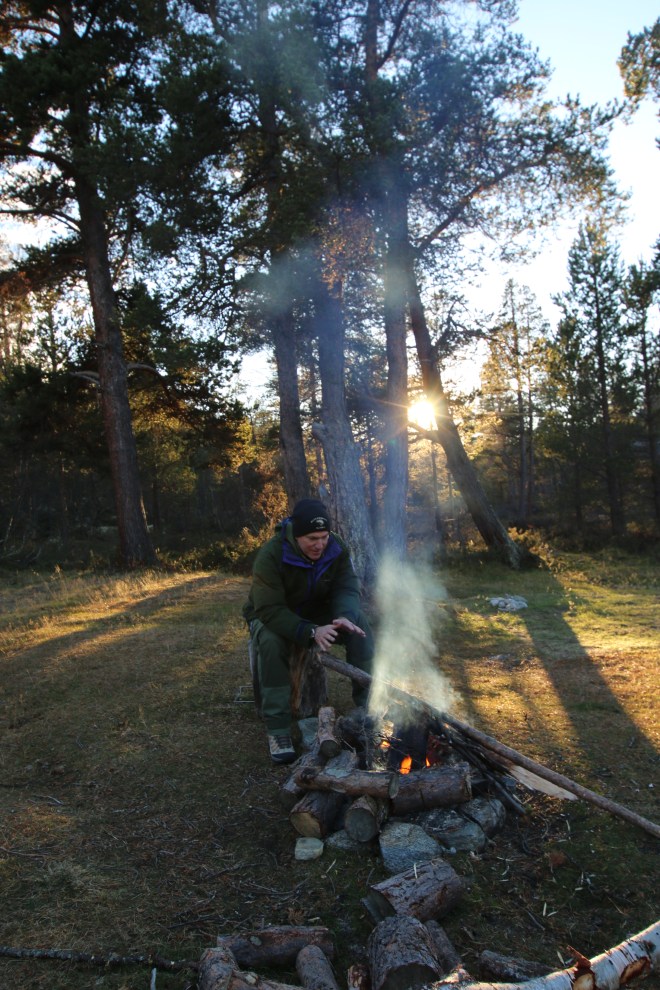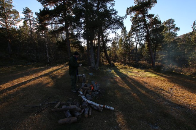 Egg og bacon til frokost i dag. Oppdaget til min store forskrekkelse at jeg hadde glemt å pakke en flaske med flytende smør. Det kan by på noen utfordringer å få lage mat uten smør!! Vi bestemte oss for å bli her en dag til, så da var det bare å sage og hugge nok ved for dagen og kvelden. Middag i dag ble stekt laks. Steikepannen min var så mettet med fett at det faktisk gikk bra uten flytende smør. Vi benyttet også anledningen til å orientere oss litt i området rundt, både nordover og sørover på T-merkede stier. Det ble noen lette regnbyer ut på ettermiddagen, men ut på kvelden klarnet det opp og ble stjerneklart. Når vi køyet hadde fullmånen kommet opp på himmelen og det var så pass kaldt at det var rim på teltduken.