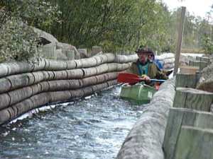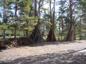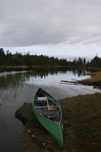 Alt utstyr ble pakket og lastet i kanoene. I dag blir det ny camp. Vi padlet nordover mot Feragen og planen er å forsere noen av tømmer-rennene. Den første tømmer-rennen kan padles, men neste renne er for smal. Her ble det en bæring på ca. 250 meter. Så et lite stykke padling før neste bæring på drøye 50 meter. Her er en av det åpne buene, denne heter Litjrennbua og navnet gjenspeiler vel lengden på renna. Campen som ble valgt ligger godt i le for nordavinden med bra tilgang til ved. Vi har hatt noen diskusjoner om antall renner, antall meter bæring. Ingen husker slike detaljer selv om vi har vært her før. Nå er alt merket på kartet til neste gang. I kveld ble det forøvrig helt vindstille, men det ble kaldt når sola gikk ned. Middag i dag ble stekt svinefilet med kokte poteter. Fortsatt uten smør…..