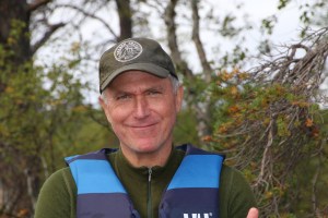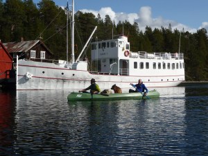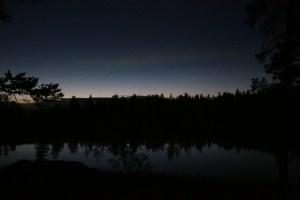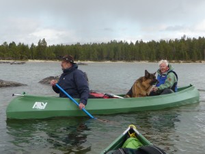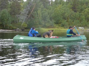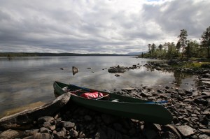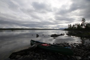 Alt var pakket og klart ved rundt kl. 11. Kanosekkene var pakket vanntett og matbagen var i tyngste laget. Vi hadde vært rause med shoppingen på Coop Mega. Pakkingen i kanoene funket etter hvert, Keith hadde forholdsvis god plass i sin 15 fot store Ally og tok matbagen og min kanosekk. Jack er et stort «kolli», med sine nesten 50 kilo og trenger god plass. Det er en stund siden Jack var i kano sist, så jeg var litt spent hvordan første etappen ville bli. Kursen ble satt mot Nordvika og Feragen. Vi hadde egentlig ikke planlagt en lang første etappe, men på grunn av kraftig vind fra syd, brukte vi lang tid og mange padletak før vi fant en fin leirplass. Faktisk så fin at Keith ga den en score på 9 av 10. Første leir ble ved utløpet av elven Mugga. Her hadde Statskog gjort jobben for oss, en fin grue, masse tørr ved og skithus. Kvelden var kald og vindfull, så det ble en enkel middag av den ikke ukjente sorten – Real Turmat. Vi var i soveposen i hvert vårt telt tidlig denne kvelden.