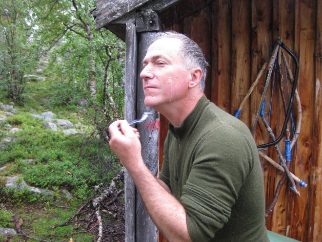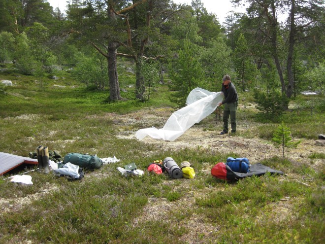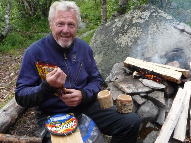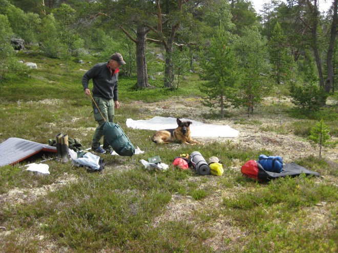 Det ble to overnattinger, en i lavvo og en natt i Litjrennbua, hvor vi sov på de harde trebenkene. Keith som har utstyr fra «over there» sov behagelig på sitt 8 cm tykke liggeunderlag. Jeg derimot, prøvde så godt jeg kunne å få noen få timer med søvn på min 3 cm. Jeg tok igjen sovingen i lavvoen.