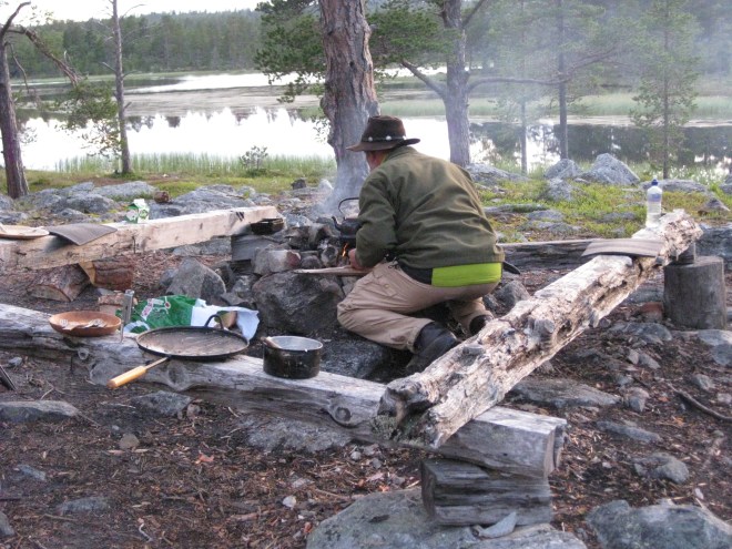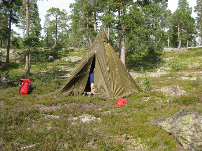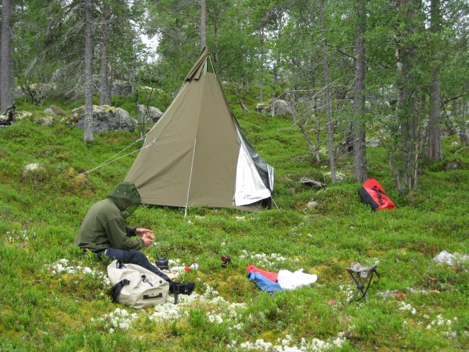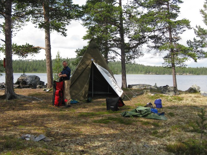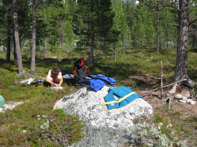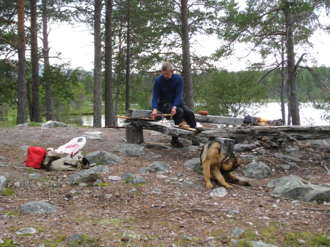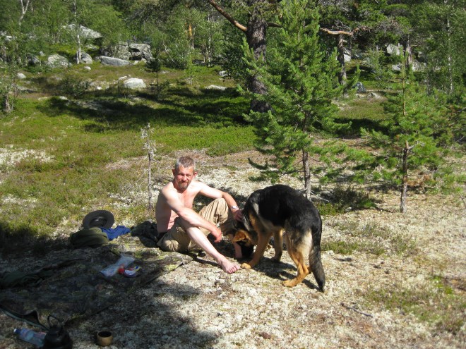 Det var en fin tur, stort sett strålende vær. Litt mygg, særlig på steder med tett vegetasjon. Vi hadde i alt 5 overnattinger. Vidar og jeg er godt voksne så vi liker å ta det rolig, stresse ned, spise god mat og ta ting som de kommer. Jack storkoste seg, gikk løs hele tiden og var nesten mer i vatnet enn på tørt land. Han simpelten elsker å bade….