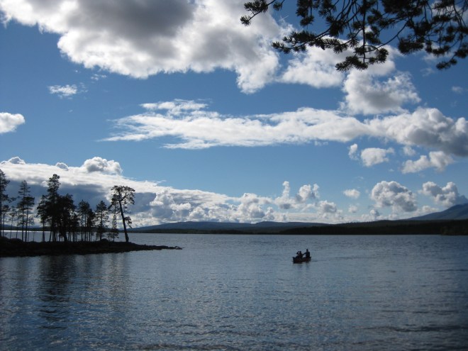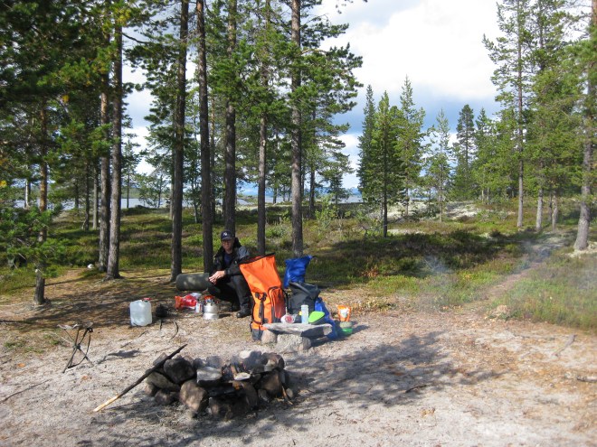 Alt var pakket og klart ved rundt kl. 11. Kanosekkene var pakket vanntett og matbagen var i tyngste laget. Vi hadde vært rause med shoppingen på Coop Mega. Pakkingen i kanoene funket etter hvert, Keith hadde forholdsvis god plass i sin 15 fot store Ally og tok matbagen og min kanosekk. Jack er et stort «kolli», med sine nesten 50 kilo og trenger god plass. Det er en stund siden Jack var i kano sist, så jeg var litt spent hvordan første etappen ville bli. Kursen ble satt mot Nordvika og Feragen. Vi hadde egentlig ikke planlagt en lang første etappe, men på grunn av kraftig vind fra syd, brukte vi lang tid og mange padletak før vi fant en fin leirplass. Faktisk så fin at Keith ga den en score på 9 av 10. Første leir ble ved utløpet av elven Mugga. Her hadde Statskog gjort jobben for oss, en fin grue, masse tørr ved og skithus. Kvelden var kald og vindfull, så det ble en enkel middag av den ikke ukjente sorten – Real Turmat. Vi var i soveposen i hvert vårt telt tidlig denne kvelden.
