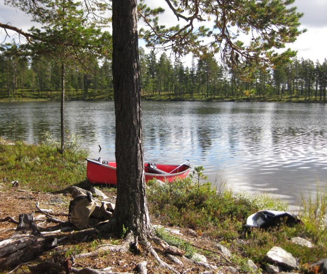 Alt utstyr ble pakket og lastet i kanoene. I dag blir det ny camp. Vi padlet nordover mot Feragen og planen er å forsere noen av tømmer-rennene. Den første tømmer-rennen kan padles, men neste renne er for smal. Her ble det en bæring på ca. 250 meter. Så et lite stykke padling før neste bæring på drøye 50 meter. Her er en av det åpne buene, denne heter Litjrennbua og navnet gjenspeiler vel lengden på renna. Campen som ble valgt ligger godt i le for nordavinden med bra tilgang til ved. Vi har hatt noen diskusjoner om antall renner, antall meter bæring. Ingen husker slike detaljer selv om vi har vært her før. Nå er alt merket på kartet til neste gang. I kveld ble det forøvrig helt vindstille, men det ble kaldt når sola gikk ned. Middag i dag ble stekt svinefilet med kokte poteter. Fortsatt uten smør…..